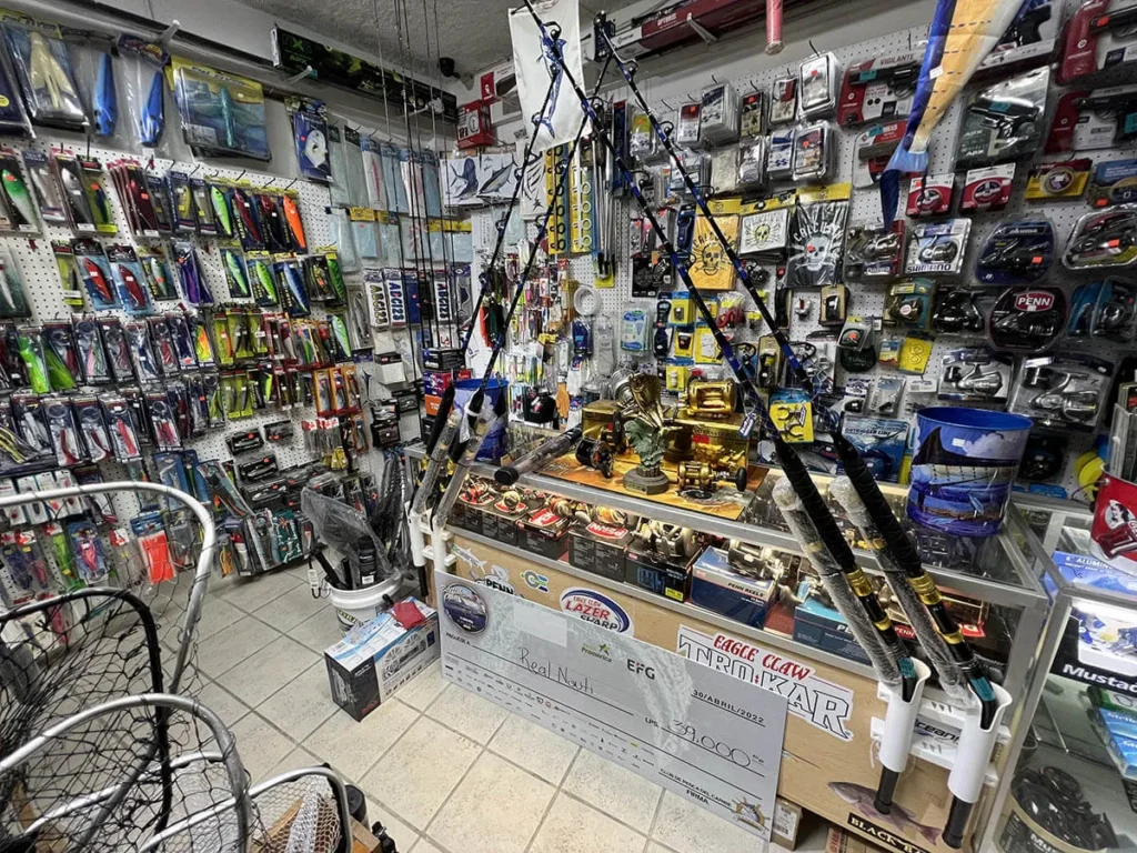 Loja moderna com grande estoque de molinetes, varas e anzóis. O atendimento é rápido e em português.